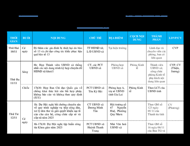 | Tiêu đề văn bản | Lịch công tác tuần của Thường trực HĐND và Lãnh đạo UBND xã (Từ ngày 10/11/2025-15/11/2025) | ||