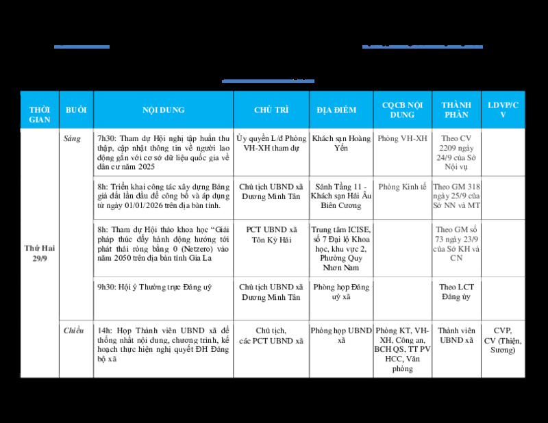 Tiêu đề văn bản | Lịch công tác tuần của Thường trực HĐND và Lãnh đạo UBND xã (Từ ngày 29/9/2025-04/10/2025) | ||