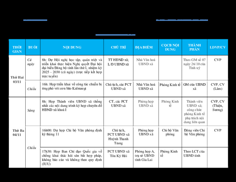 | Tiêu đề văn bản | Lịch công tác tuần của Thường trực HĐND và Lãnh đạo UBND xã (Từ ngày 3/11/2025-07/11/2025) | ||