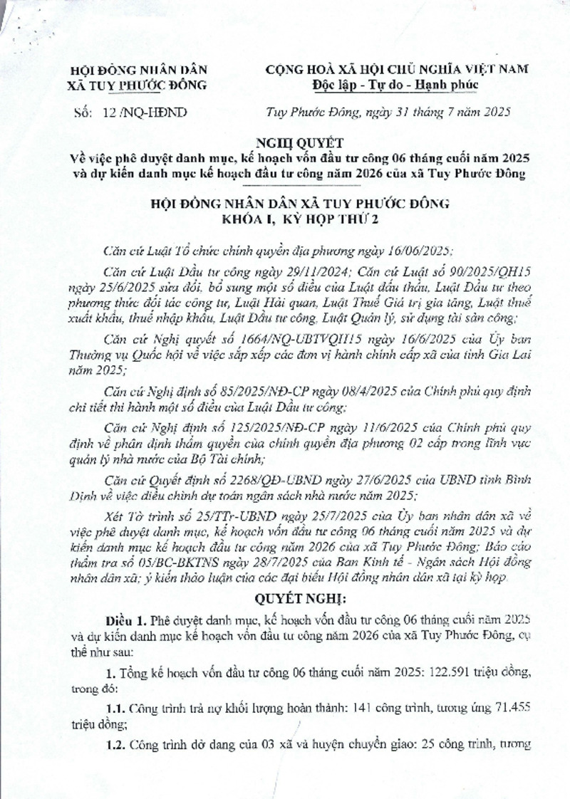 | Tiêu đề văn bản | về việc phê duyệt danh mục, kế hoạch vốn đầu tư công 06 tháng cuối năm 2025 và dự kiến danh mục kế hoạch đầu tư công năm 2026 của xã Tuy Phước Đông | ||